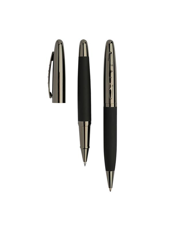 O MERUSIT é um sofisticado conjunto de esferográfica e roller de corpo metálico com toque de borracha, ambos com escrita de alta qualidade. Acompanhado de um elegante estojo de oferta em cartão forrado a cetim no interior, este conjunto é perfeito para presentear de forma única e glamorosa. Ideal para personalização, o MERUSIT é uma opção de presente corporativo ou brinde sofisticado.